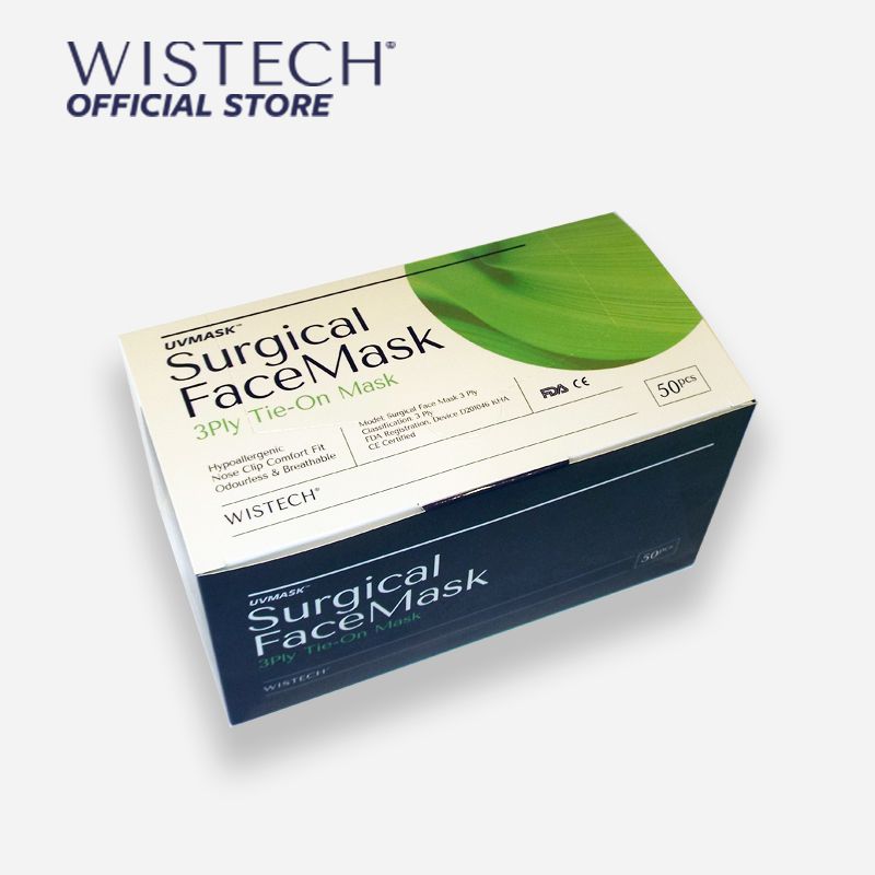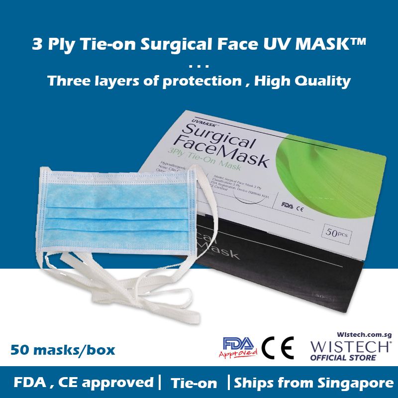 50 masks / box Tie on Filtration Efficiency: BFE ≥ 99% DP <49Pa/cm2 MC ≤1cfu/g Color : Blue Material:Non-woven FDA Approved CE Approved Delivery from Singapore Box dimension 85mm(H)x200mm(L)X105mm(W) MEDICAL GRADE UVMASK™️ Tie-on Surgical Face Mask helps prevent dust, bacteria and dangerous diseases through inhalation effectively. Model: Surgical Facemask 3...