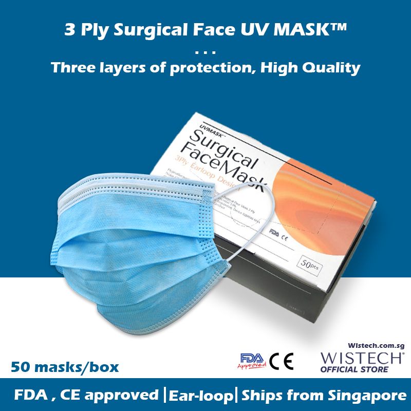 [Ready Local stocks] Wistech 3 Ply Surgical Face UV MASK ™️, 50 pieces, FDA CE Approved, Fast delivery, Delivery from Singapore, Manufacturer