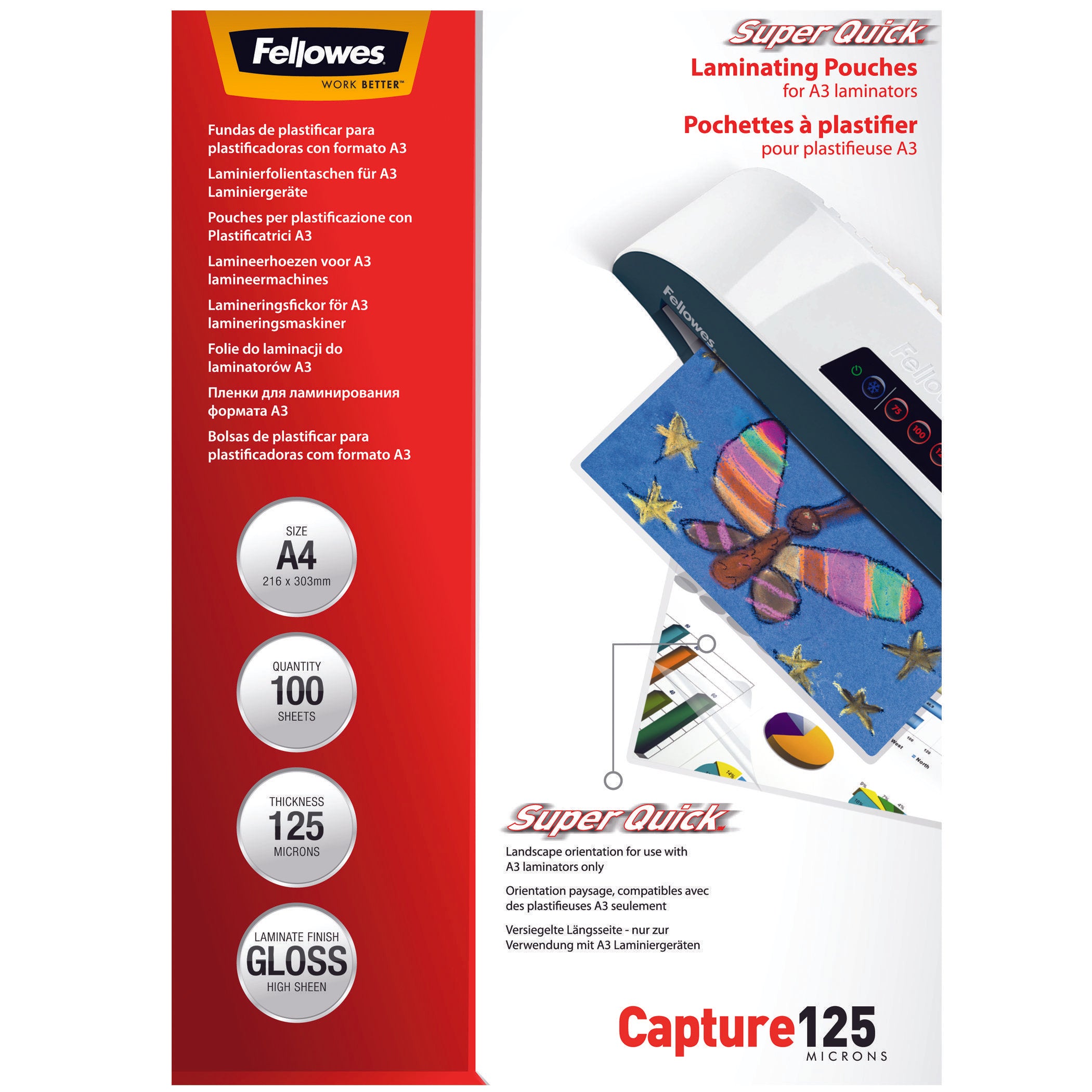 Fellowes SuperQuick laminating pouches are sealed on the landscape edge, meaning that laminating can be done up to 40% faster. These gloss finish A4 pouches are available in 80 and 125 Microns for a basic or advanced level of document protection, making them ideal for notices, photos, instructional materials and frequently handled documents. As the seal is on the long edge of the pouch, these are compatible with A3 laminators only. Fellowes laminating pouches ensure 100% Jam Free performance when used with Fellowes laminators.
