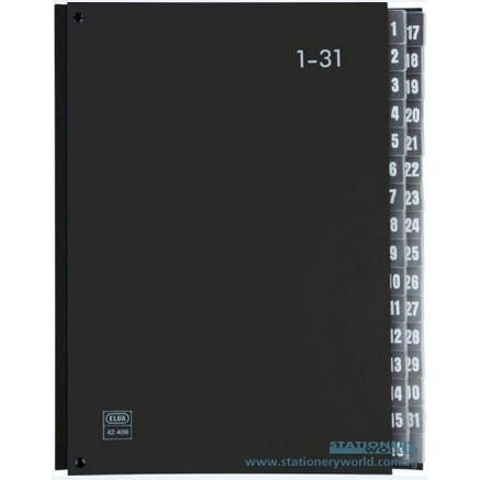 42408, NUMBERED 1-31 An expanding file with indexes.-Available in Black, Blue, Red-Size: 340 x 262 x 45mm (H x W x D)-For A4 and FC-PVC Laminate covers,-Bonded-PP Tabs 1-31-With 3 peek holes in book pages-Expandable cloth spines