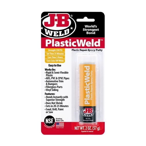 PlasticWeld is a hand-mixable, fast-setting epoxy putty that forms a durable bond to most major plastic types. *After mixing, it forms a polymer compound that can be molded or used to build up and repair just about anything made from plastic. When cured, it can be sawed, drilled, carved, sanded and painted. PlasticWeld has a 20-25 minute work life; functional cure occurs in 2-3 hours. PlasticWeld cures to an off-white color, is rated at a tensile strength of 350 PSI. Does not adhere to polyethylene, polypropylene or some other plastics. Test for adhesion first.