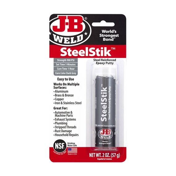 SteelStik is a hand-mixable, steel-reinforced, non-rusting epoxy putty that quickly repairs or rebuilds anything made of metal. After mixing, it forms an industrial-strength polymer compound that can be molded into shapes or used to build up, patch and repair steel components. SteelStik sets in 3-5 minutes and after 60 minutes, can be drilled, tapped, machined, ground, filed and painted. SteelStik cures to a dark grey color, is rated at a tensile strength of 900 PSI and will withstand temperatures up to 300ºF.