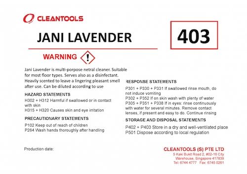 Jani Lavender is a multi-purpose neutral cleaner. Suitable for most floor types. Serves also as a disinfectant. Heavily scented to leave a lingering pleasant smell after use.