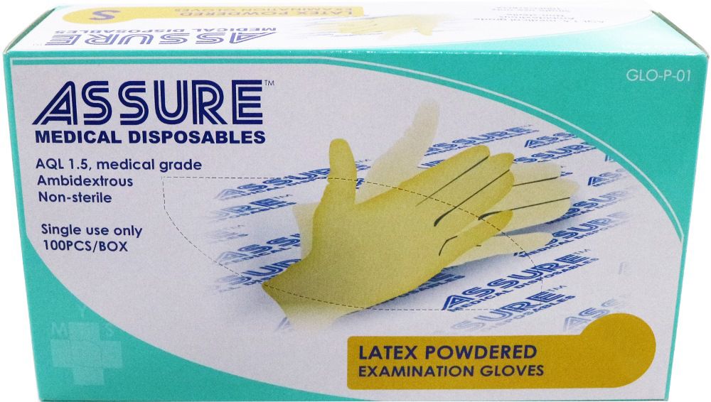 Examination Gloves (Assure), Latex, Lightly Powdered, Non-Sterile, Medium, GLO-P-02, 100 Pc/Box, Per Box