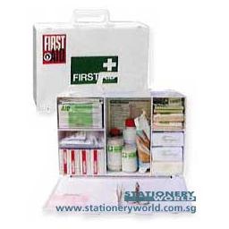 Suitable for general use in offices, theatres,cinema, church halls and institutes. - 30.5 x 21 x 12 cm - For use in work place where the number of person employed does not exceed 10. - 1 Absorbent Gauge 10's - 1 Acriflavine Solution - 1 Antiseptic Cream - 1 Antiseptic Solution - 1 Basic Advice on First Aid at Work - 2 Cotton Balls 10's - 1 Crepe Bandage 2'' - 1 Crepe Bandage 3" - 1 Disposable Resuscitation Pack - 1 Dressing Forceps - 1 Dressing Scissors - 2 Europlast 10's - 1 Hypoallergenic Tape - 1 Safety Pin 12's - 2 Singlefix Finger Dressing (Sterile) - 2 Surgifix Size 1-2 - 1 Surgifix Size 3-4 - 1 Surgifix Size 5-6 - 2 Triangular Bandage